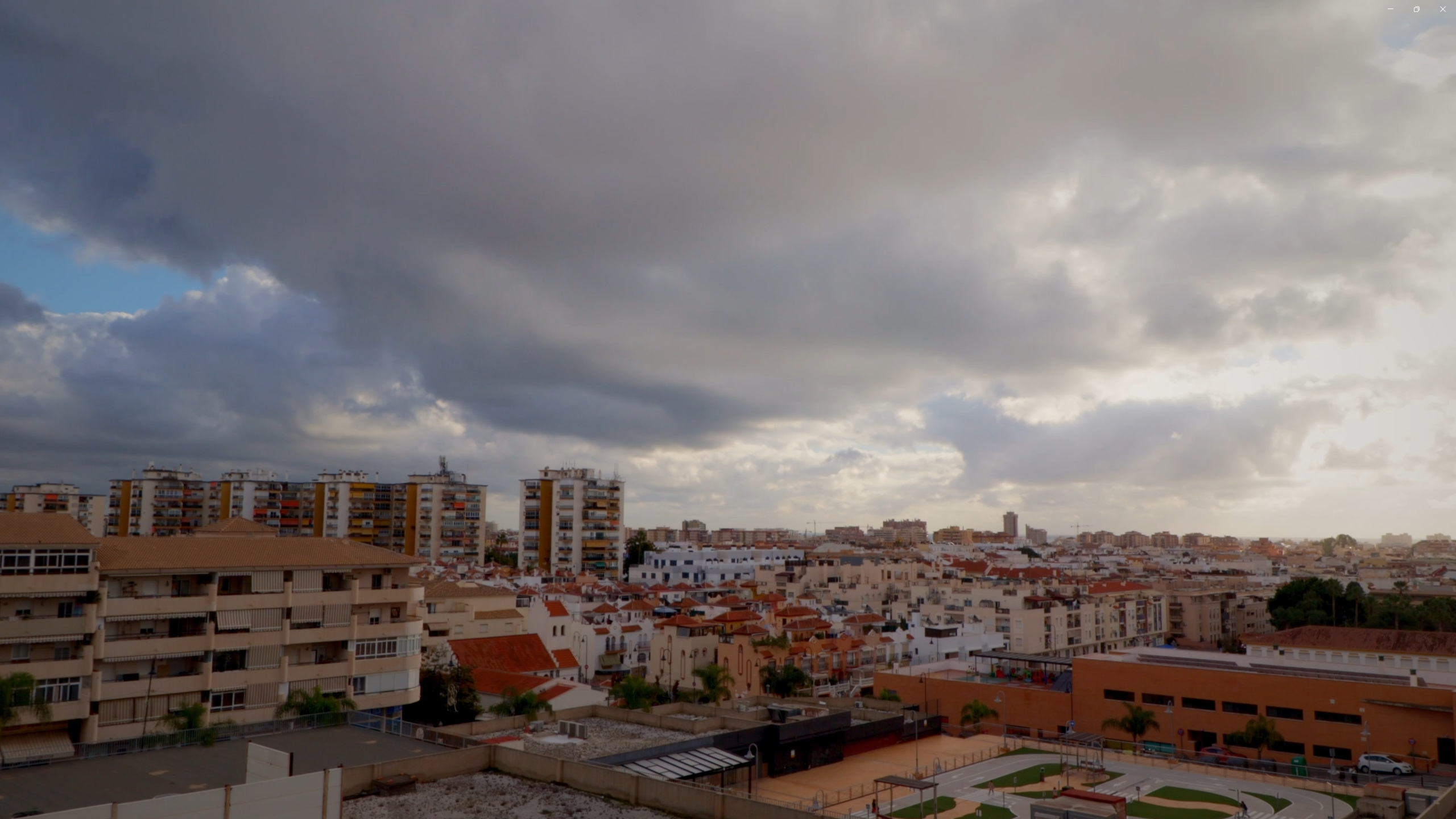 A panoramic view of a city. In the foreground, there are several residential buildings with red tile roofs. Some of the buildings are taller than others and have a more modern appearance. Behind these buildings, there is a larger area of the city with a mix of residential and commercial buildings. The sky is cloudy, with large, dark clouds covering most of the sky. There is a hint of blue sky visible in the distance. The overall atmosphere of the image is somewhat gloomy, but the city still appears to be bustling with activity. (test)